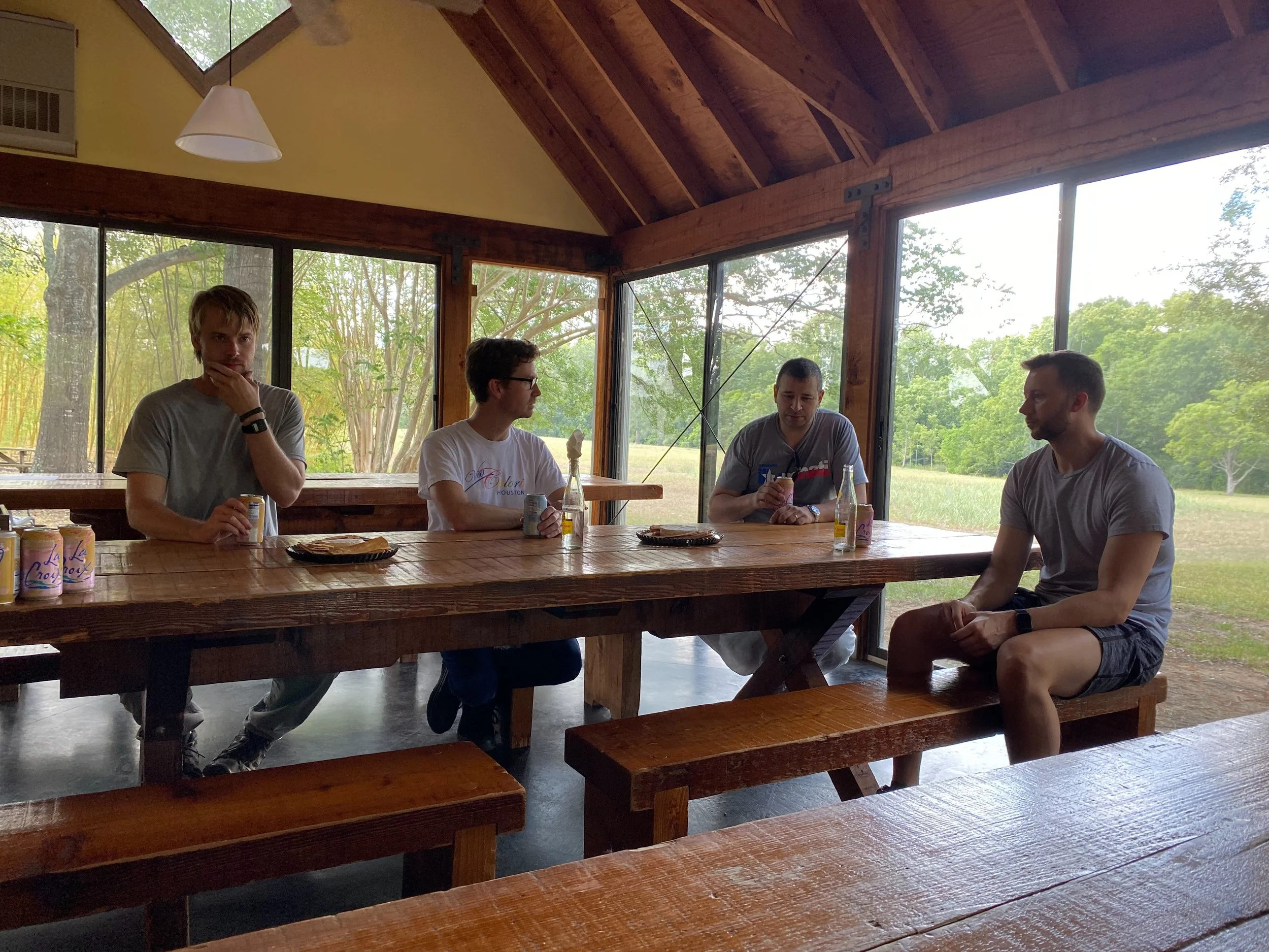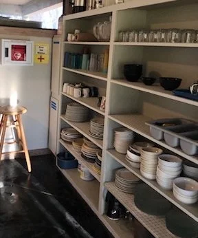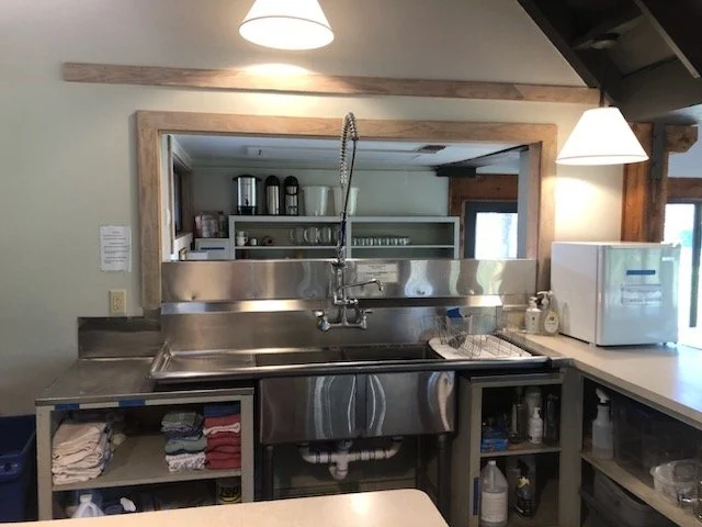 Adjacent to the kitchen is the dining hall set up with four long tables and bench seating accommodating up to 40 people. Dishes, silverware and drinking glasses are all provided.